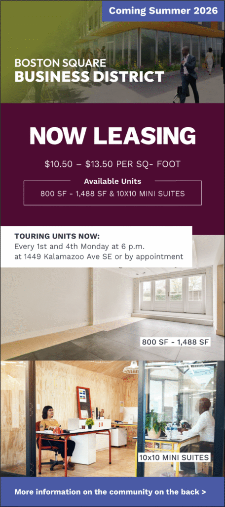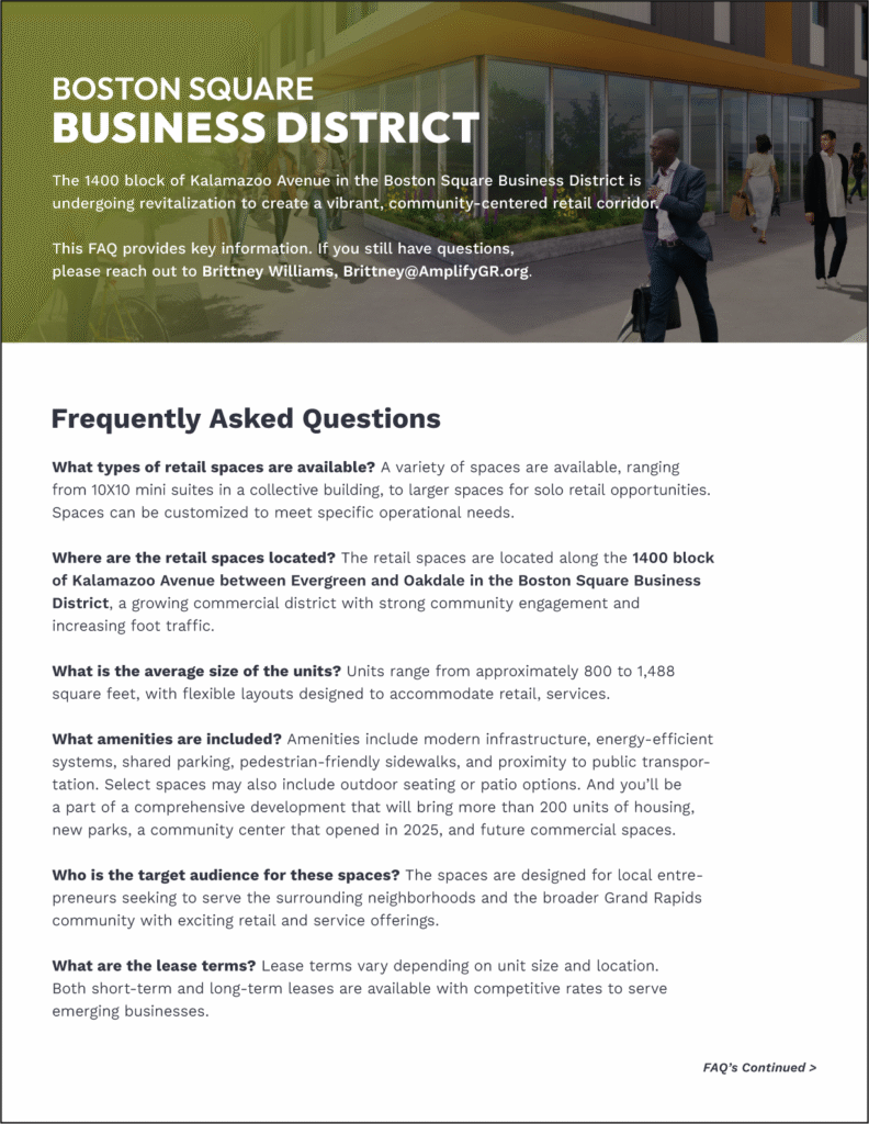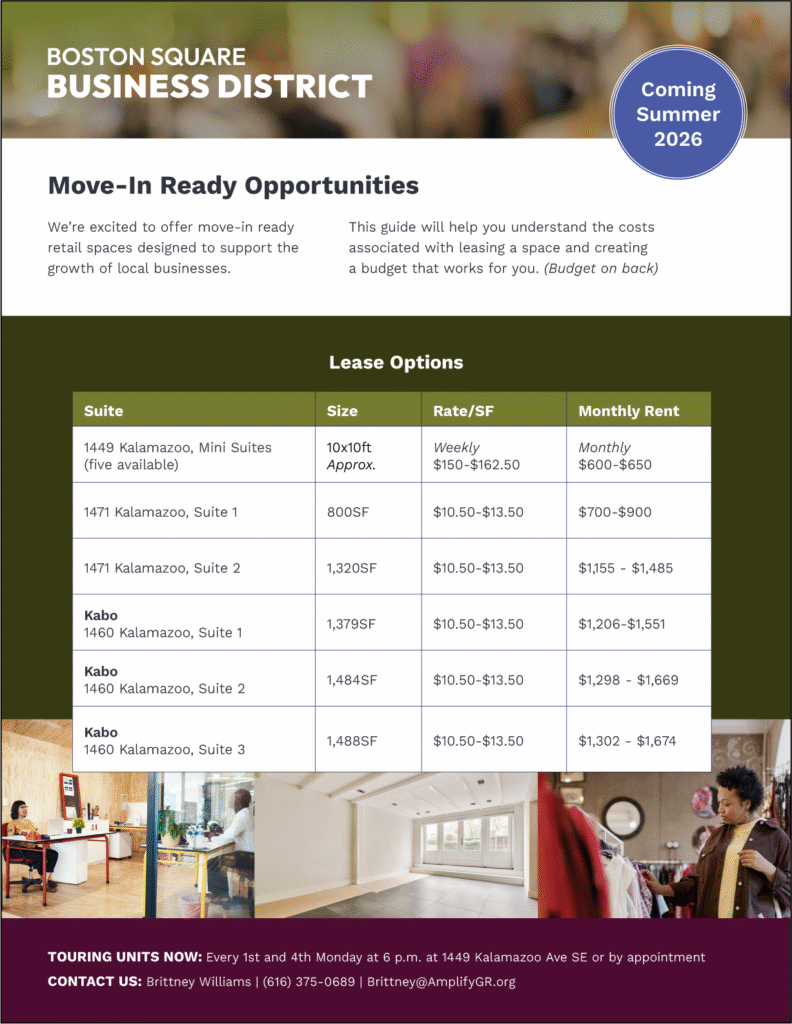 Schedule a tour with Amplify GR Kalamazoo Avenue Development Coordinator (Brittney Williams) to discuss availability and build-out options.